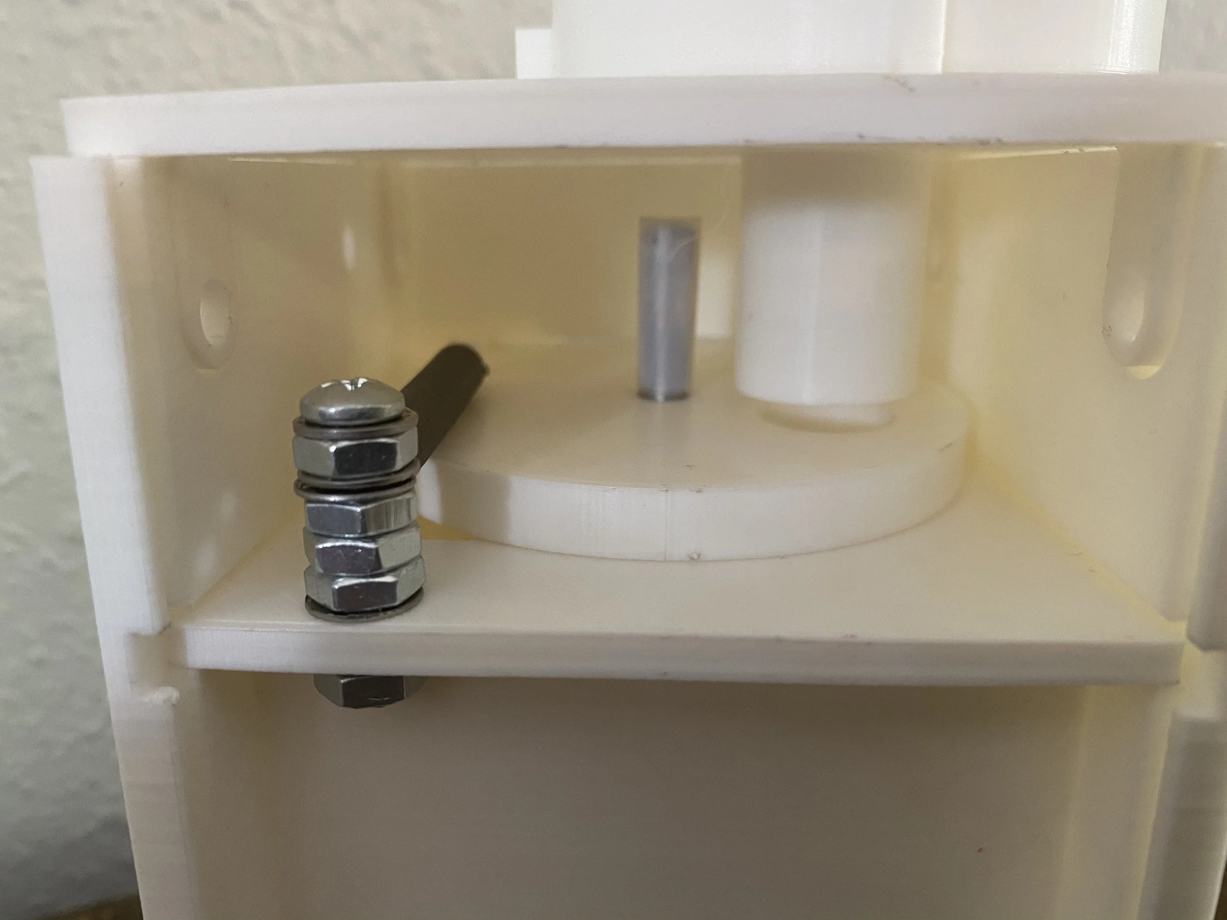 Reload: Releasing the lever causes the attached pre-loaded spring to snap back the disc so that the hole is in line with the funnel, causing a new M&M to be in the pocket, waiting for actuation.